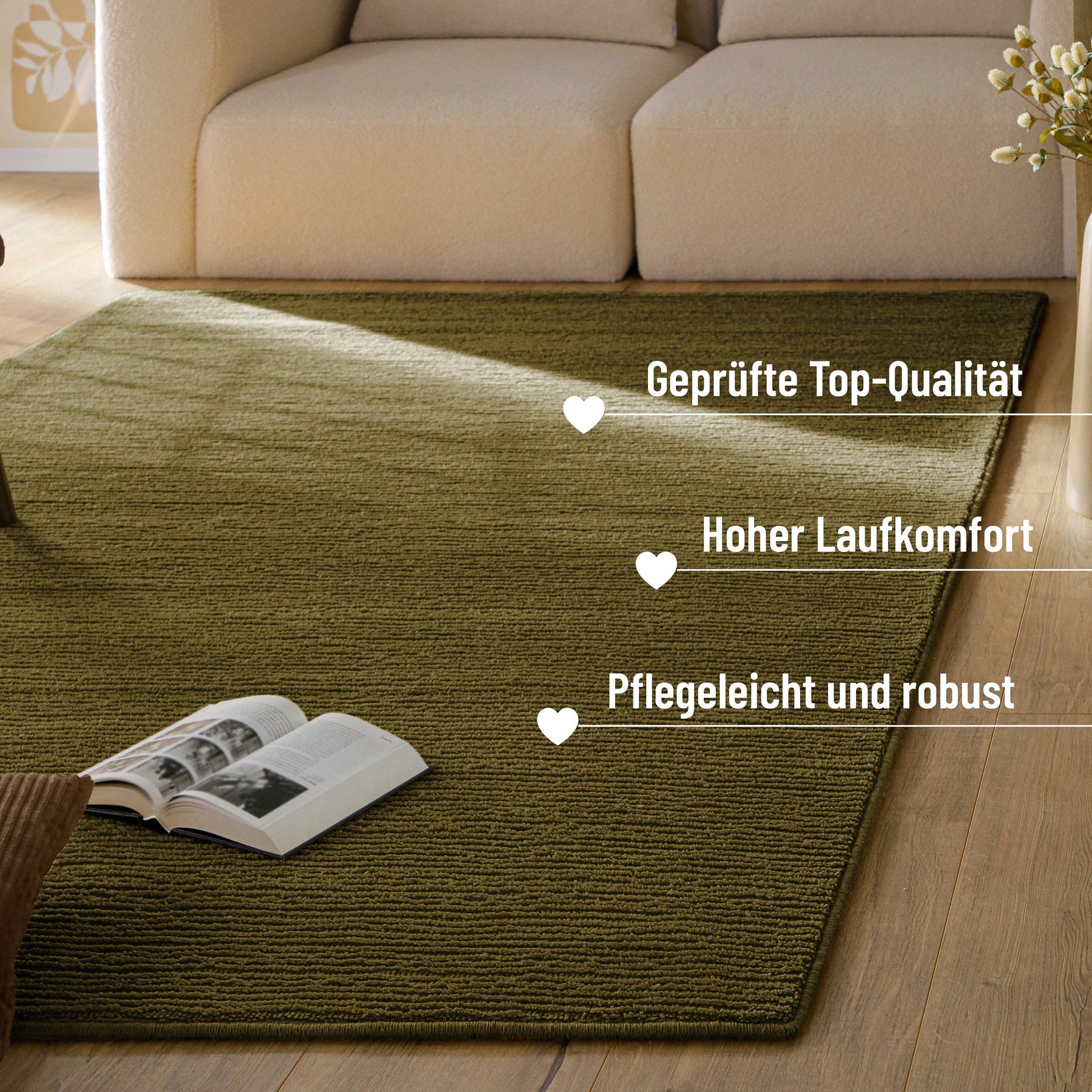 Manche Teppiche sagen nichts. Castello One sagt: „Clean, cozy, clever“. Mit seinem feinen Hoch-Tief-Rauten-Muster, das fast wie eingestanzt wirkt, bringt er Struktur ins Spiel – ohne laut zu werden. Die dezente Farbe? Passt sich an, aber hebt sich trotzdem ab. Und die Schurwolle? Die fühlt sich nicht nur gut an, sondern sieht auch noch verdammt gut aus. Ob als Eyecatcher im Wohnzimmer, Upgrade im Flur oder Ruhepol im Schlafzimmer – Castello One macht alles mit. Er ist der Typ Teppich, der deinem Interior ein „Wow“ verpasst, ohne zu übertreiben. Und ganz ehrlich: Es dauert nicht lange, bis jemand fragt „Wo hast du den Teppich her?“. Die Antwort liegt dir dann genauso entspannt auf der Zunge wie deine Füße auf Castello. Also gönn dir Design zum Drauftreten.