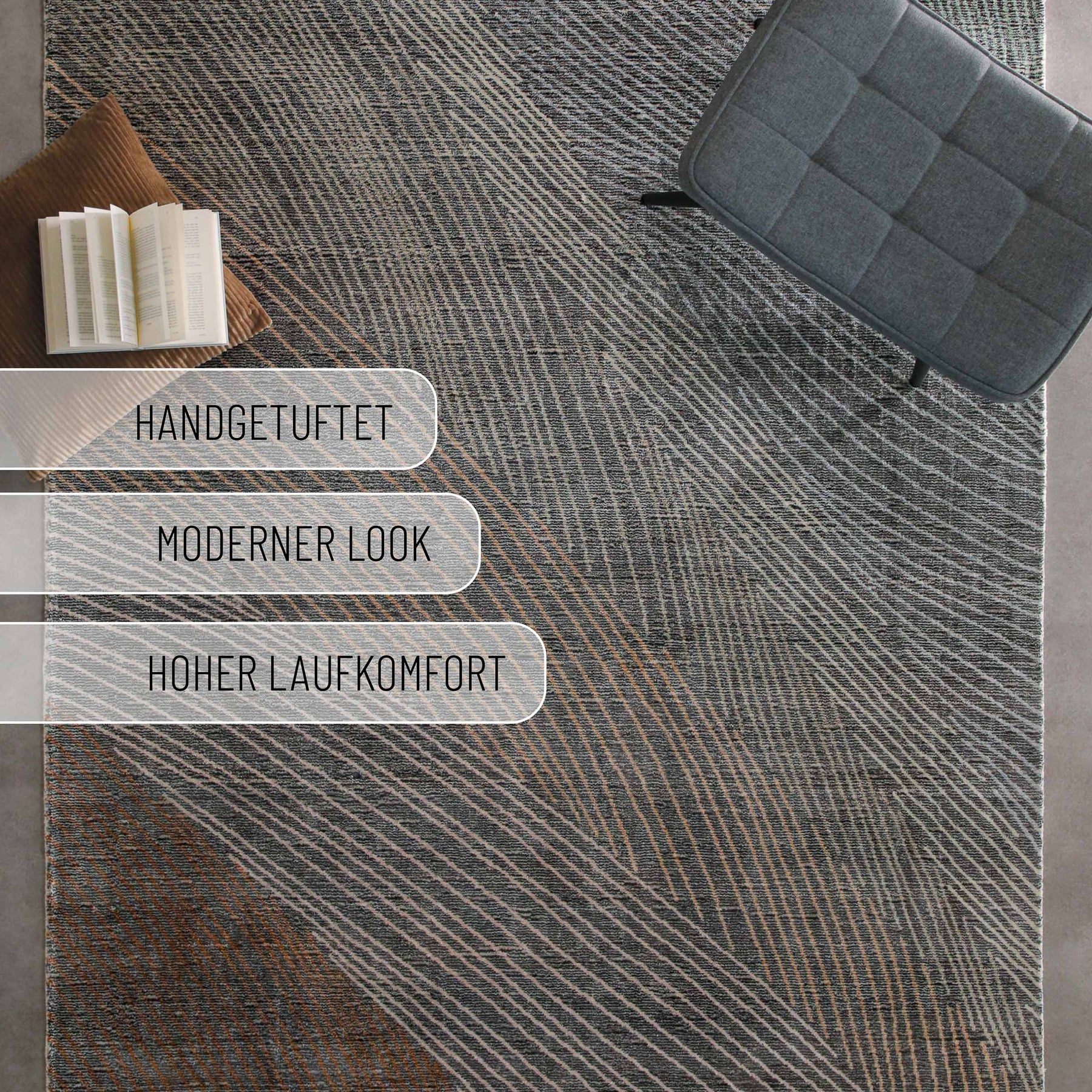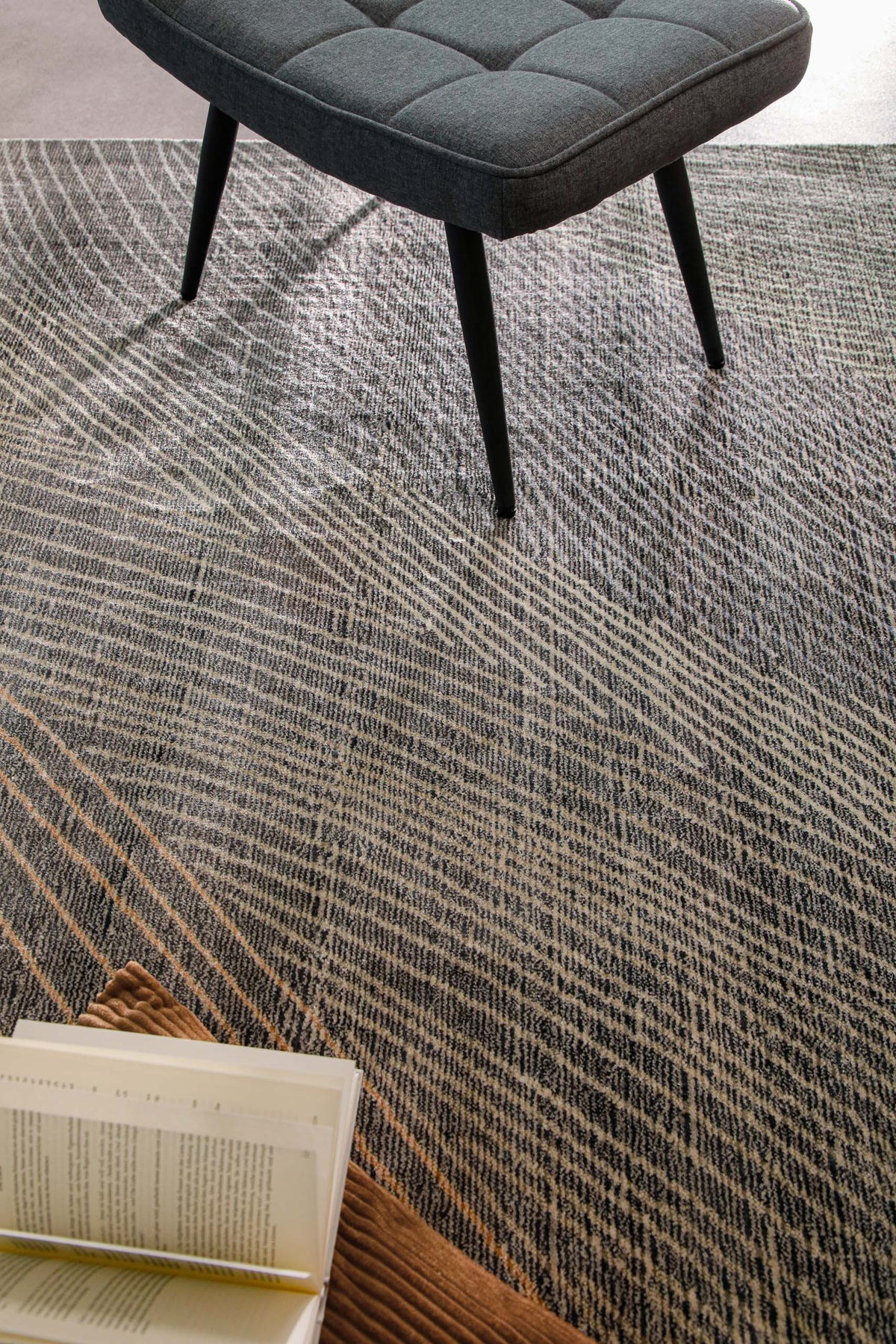 • Je nach Lichteinfall schimmern die Linien leicht – das verleiht dem Teppich Tiefe und eine elegante Bewegung. Besonders schön bei Tageslicht.