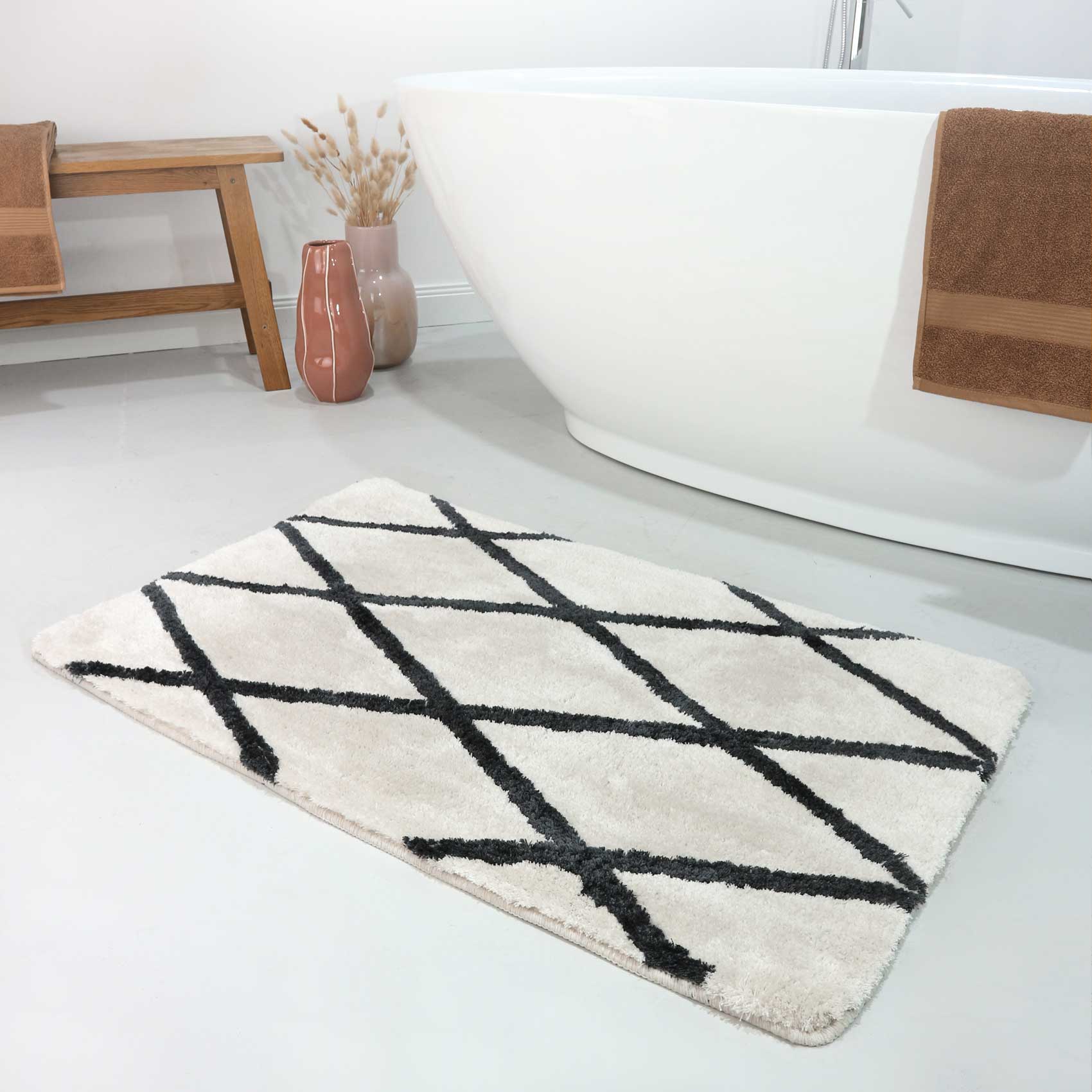 Der getuftete Badteppich San Bosa von Homie Living ist ein moderner Designer-Teppich, der das gewisse Etwas ins Bad zaubert. Das geometrische Rautenmuster ist zeitlos, elegant und echt stylish. Der hohe Flor umschmeichelt die Füße und sorgt für Gemütlichkeit. San Bosa ist mit einer rutschhemmenden Gummierung ausgestattet, eignet sich für Fußbodenheizungen und kann bei 30 Grad in der Waschmaschine gereinigt werden. Die Kombination aus Design und Funktionalität machen ihn zu einem absoluten Lieblingsteppich. Die verschiedenen Größen passen sich optimal den räumlichen Gegebenheiten an.
